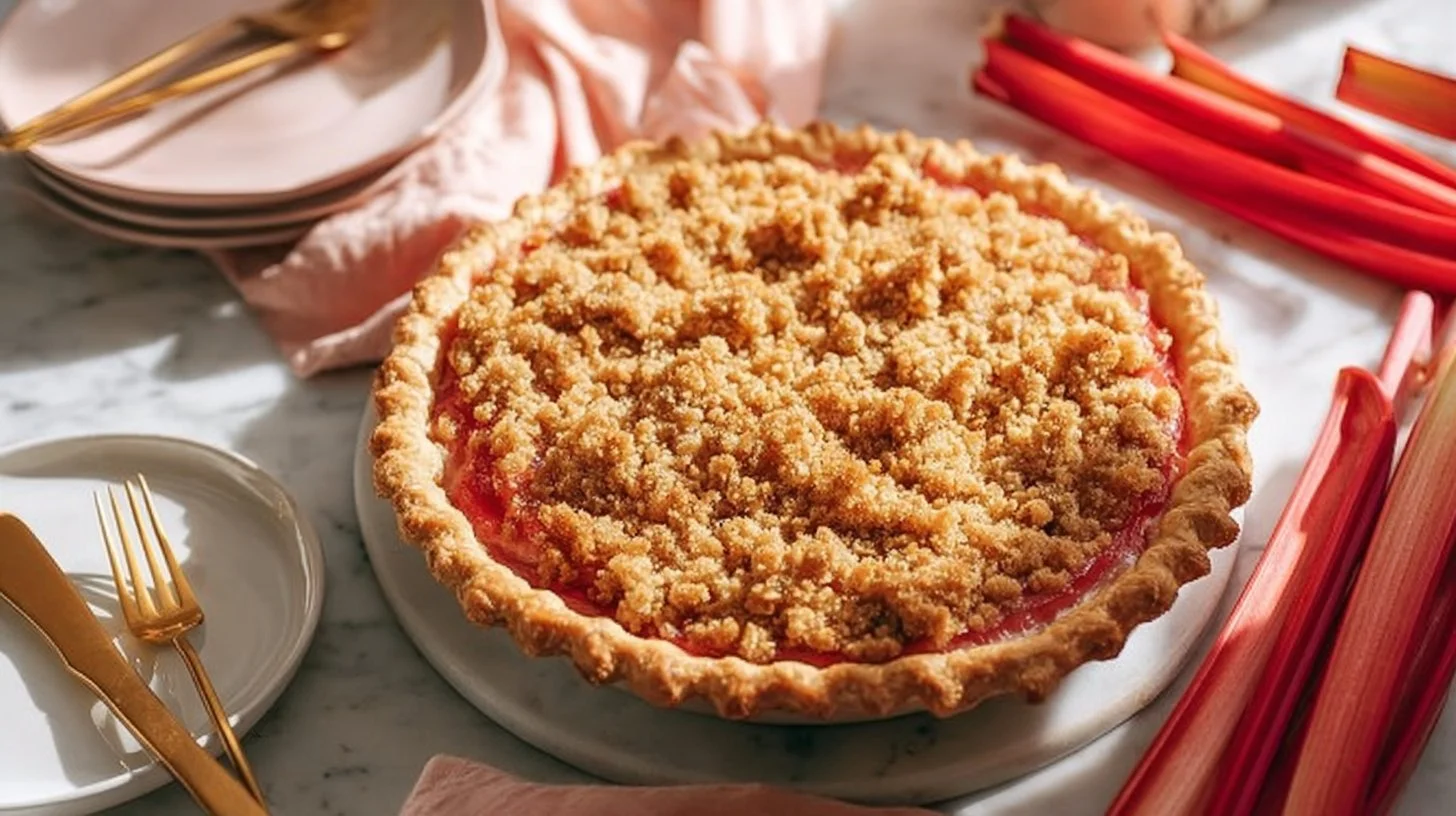 - Roll out the pie dough and transfer it to a standard 9-inch pie pan, crimping the edges. Pour the rhubarb filling into the crust. Sprinkle the crumble topping evenly over the filling.